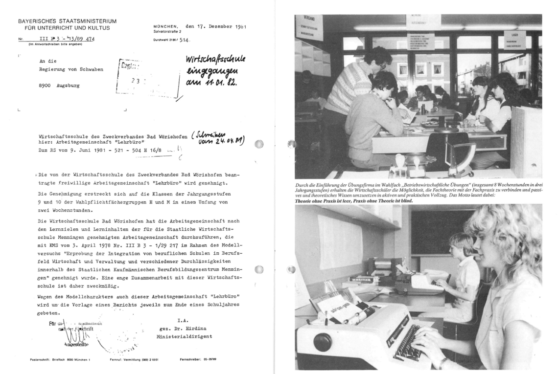 1981 begann die Wirtschaftsschule (als zweite Schule in Bayern) den Modellversuch “Übungsfirma”. Hier erhalten die Wirtschaftsschüler die Möglichkeit, Theorie und Praxis zu verbinden.
