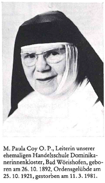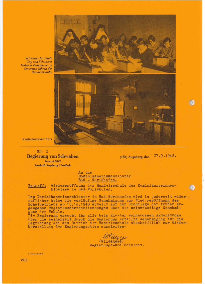 Gründung als einjährige Handelsschule. Leitung: Schwester M. Paula Coy O.P.